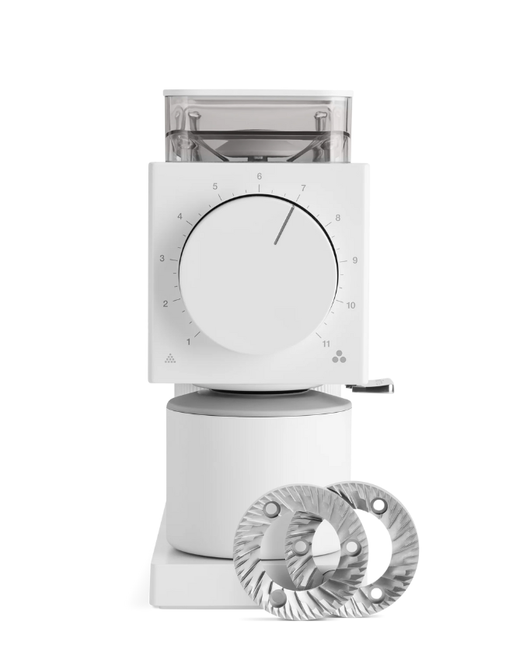 64 mm flat burrs (“Gen 2 Brew Burrs”) with a two-stage geometry designed to deliver finer, more consistent particle size for enhanced extraction.